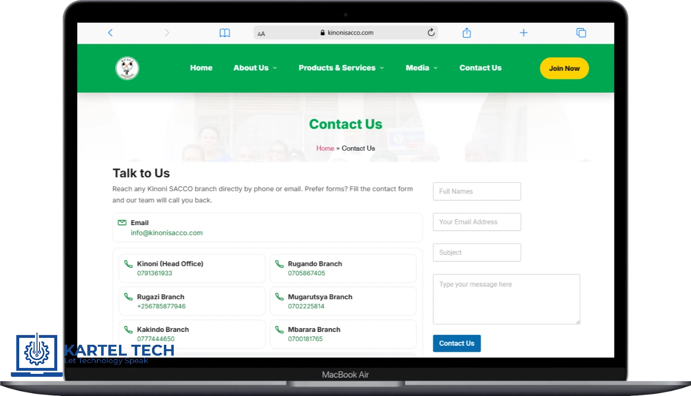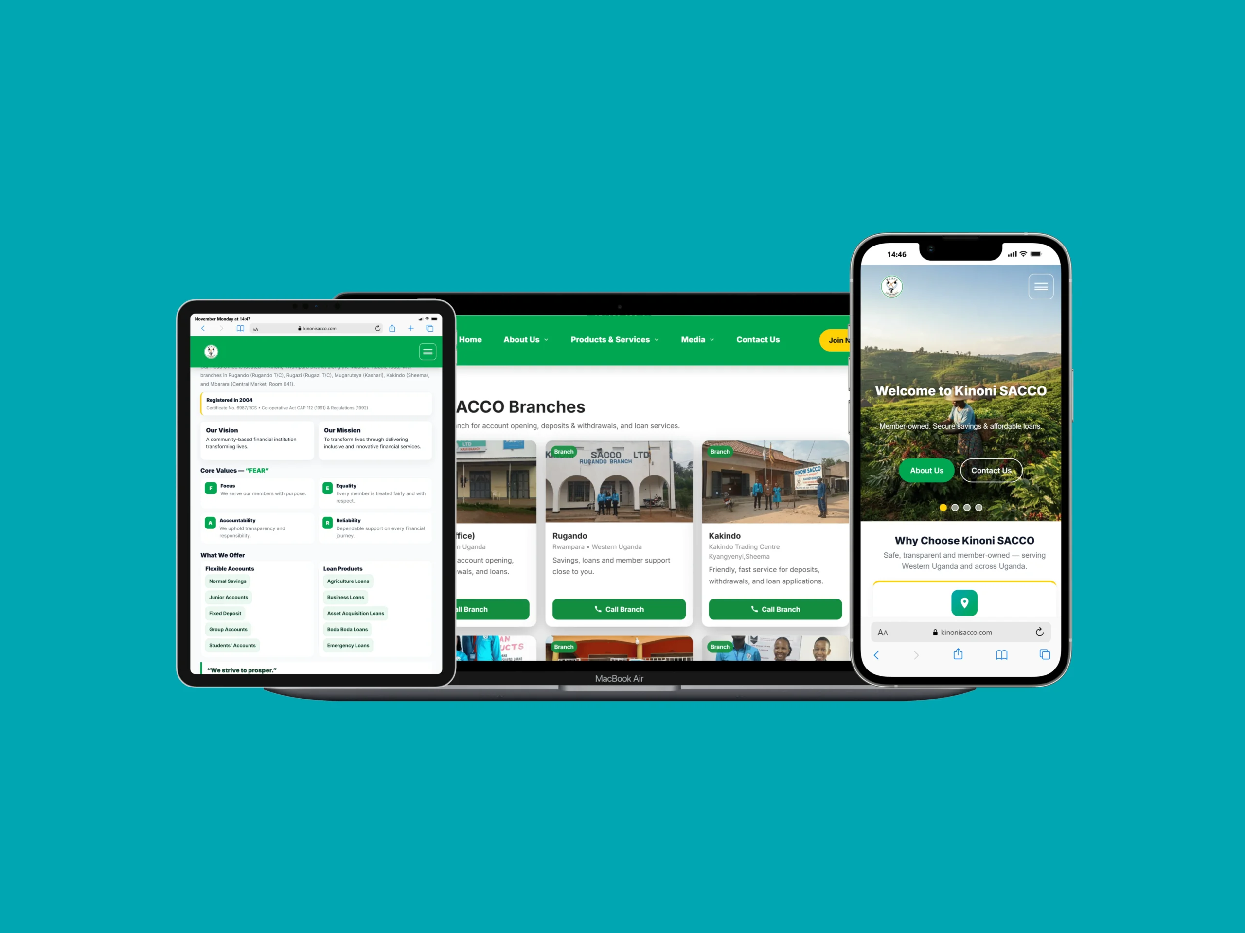 This SACCO Website was created for Kinoni SACCO to organize all member-facing information into one reliable and professional platform. Before the website, most communication happened through office visits, notices pinned on walls, and word-of-mouth within branches. The new site gives members and potential clients a direct place to understand how the SACCO operates without depending on physical interaction.